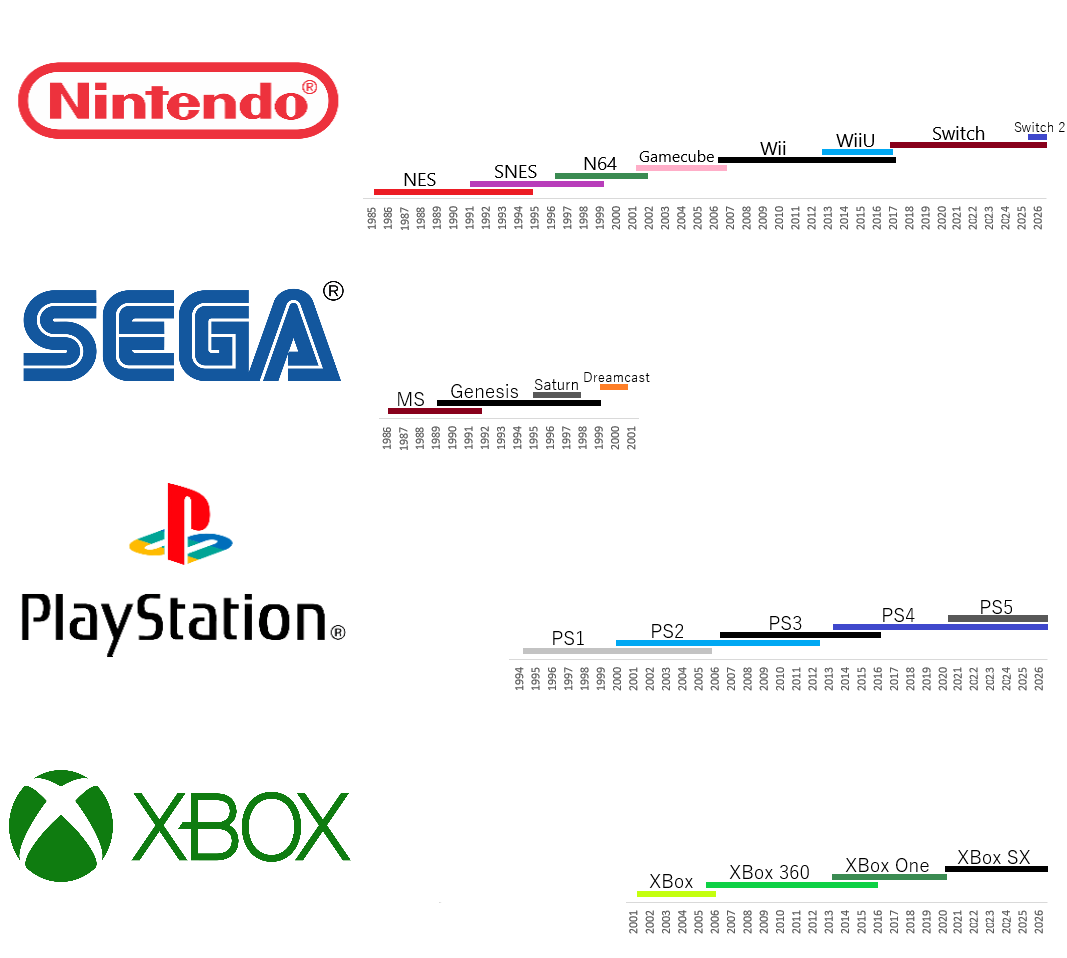 Alerte nerdgasm : infographie sur la durée de vie des consoles, par constructeur. Tu noteras qu’il y a des chevauchements assez fous pour certaines machines (PS2, Wii, Xbox 360, etc…) Source : et hop !et hop !